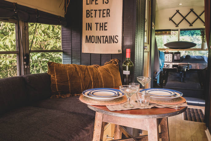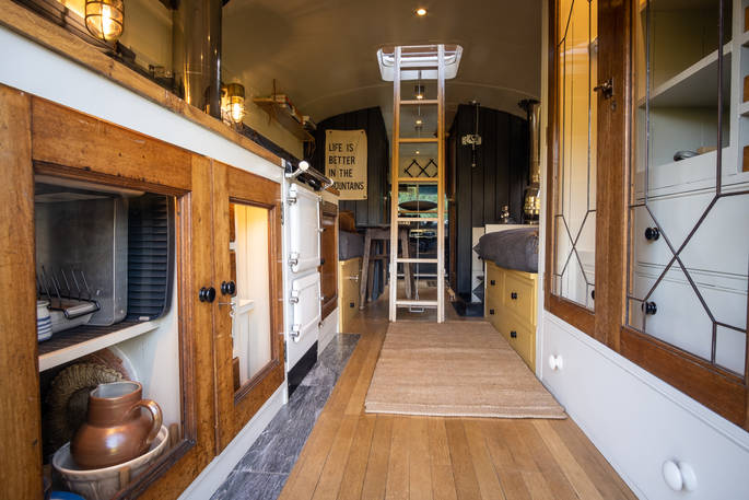 The interior of the van has an old British cottage vibe, with a warm wood finish and cosy furnishings. It fits in perfectly with the view that you look out to and makes you feel comfy and warm just looking at it. With just the one double bed up top, it’s a great stay for a couple’s getaway.